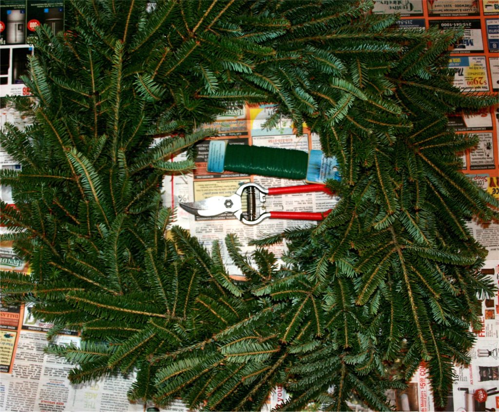- Place your wreath on top of the newspaper and study it. Wreaths might have spots that are not as thickly packed with evergreen branches. Don’t worry, they will be when you’re finished. It helps to be aware of them when you lay out your extra greens in a dry run.