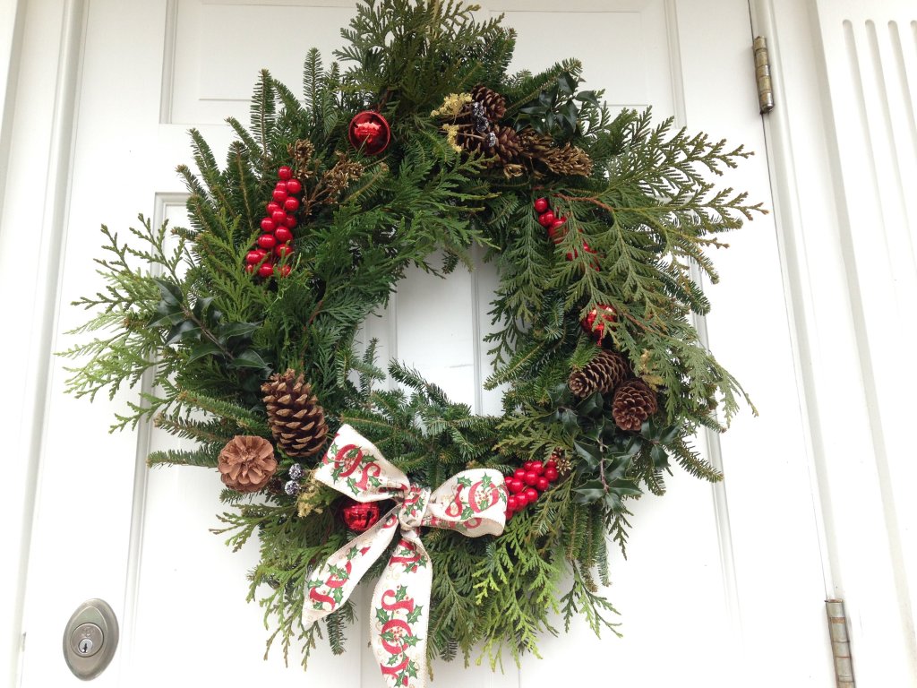 I like to make my wreaths with natural elements, but I often add red berry picks purchased at a nearby craft store. You can also put in jingle bells or ornaments. Items such as bells or glass balls are best attached by string to the sturdiest branches of your wreath.