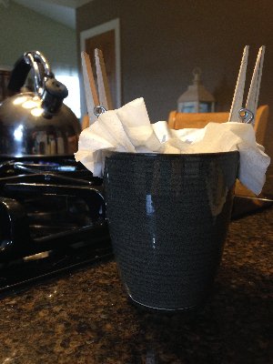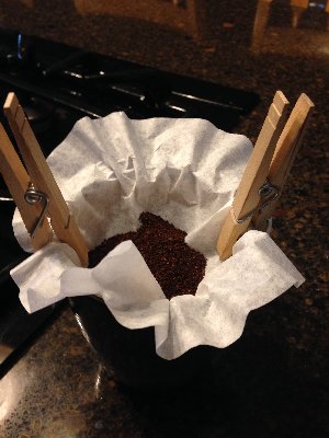 So, I took a coffee filter, which has been hanging around since the last Probstock (not the mini, mind you, but the full blown Probstock family gathering), and the container of Folgers (same era, so probably too stale for most folks), a pair of clothespins and a mug. I heated water in the coolest tea pot ever (a gift from my youngest) which I use for tea and, more often, hot chocolate, which is my favorite hot beverage no matter the season.