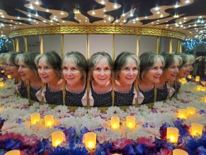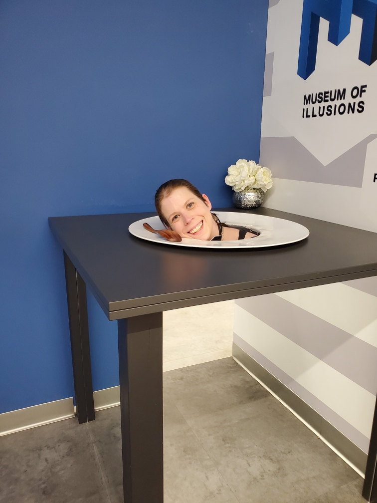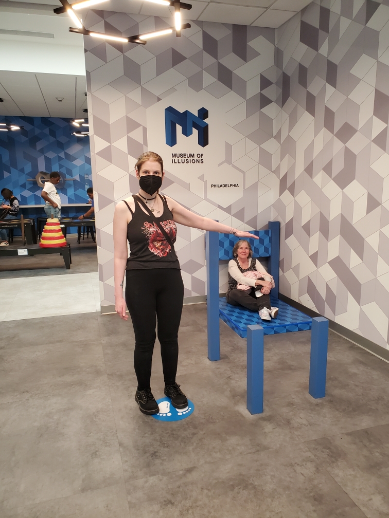 Afterward, we walked a short distance to the Museum of Illusions (https://moiphilly.com). This contained similar warnings for those with seizure disorders, etc., but no waiver required. When we first entered, I was overwhelmed by the noisy children, but really, I couldn’t blame them for their boisterous exuberance. This old lady got a bit exuberant herself. There were numerous and frankly unbelievable illusions to be created by the placement of one’s body, the mirrors on hand, or the distances between one element and another and a person’s line of sight. Such fun to be had for young and, yeah, old.