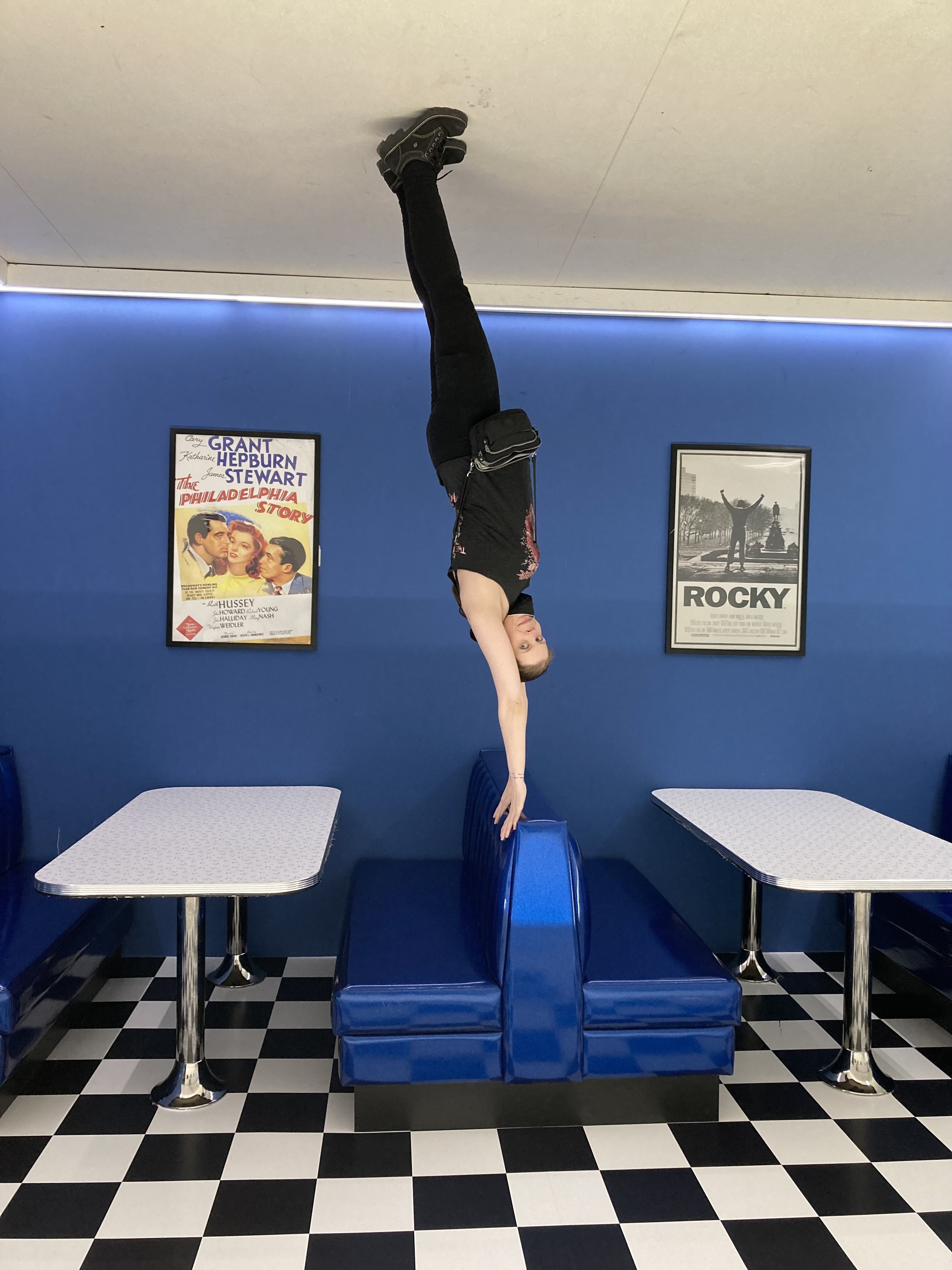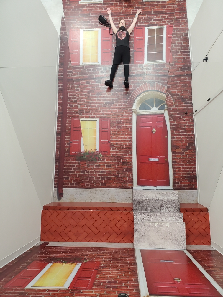 Afterward, we walked a short distance to the Museum of Illusions (https://moiphilly.com). This contained similar warnings for those with seizure disorders, etc., but no waiver required. When we first entered, I was overwhelmed by the noisy children, but really, I couldn’t blame them for their boisterous exuberance. This old lady got a bit exuberant herself. There were numerous and frankly unbelievable illusions to be created by the placement of one’s body, the mirrors on hand, or the distances between one element and another and a person’s line of sight. Such fun to be had for young and, yeah, old.