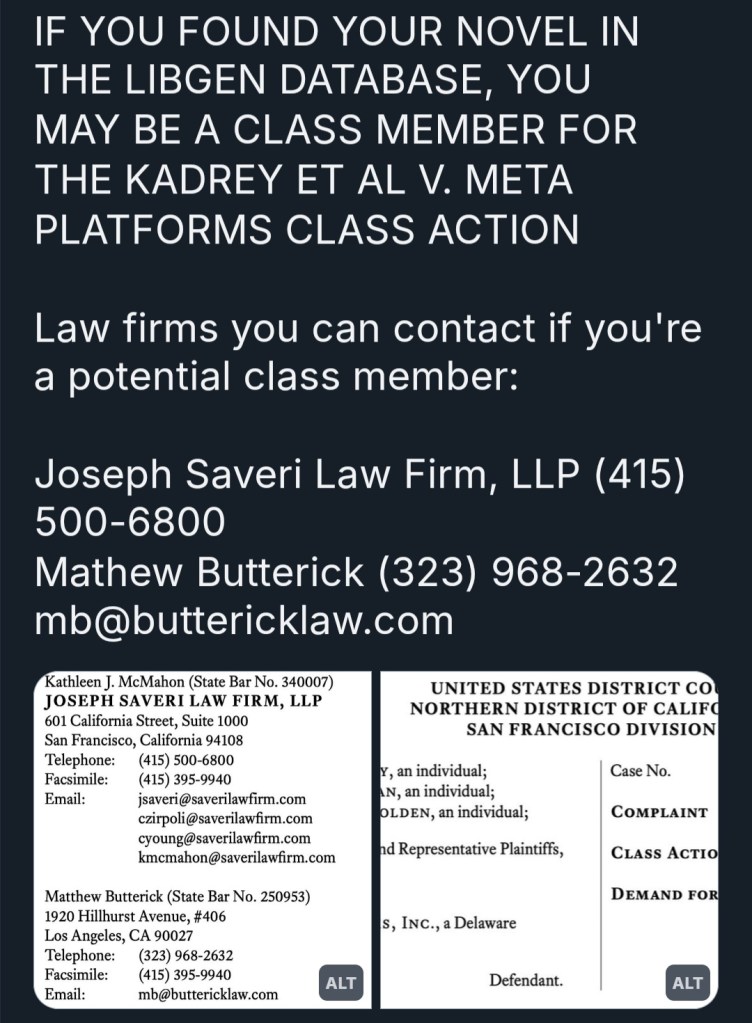 After searching for your name/pen name to see if you, too, have been pirated, directly below is a screenshot sent to me by my son. It shows the contact information for two law firms involved in the current class action suit. I will be doing so shortly.